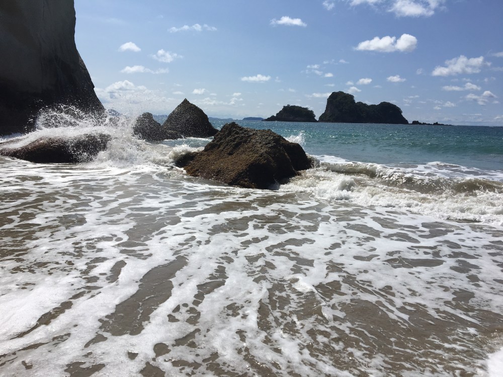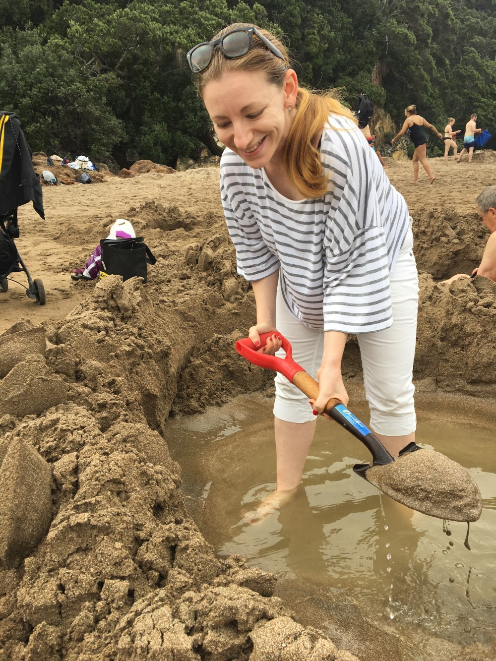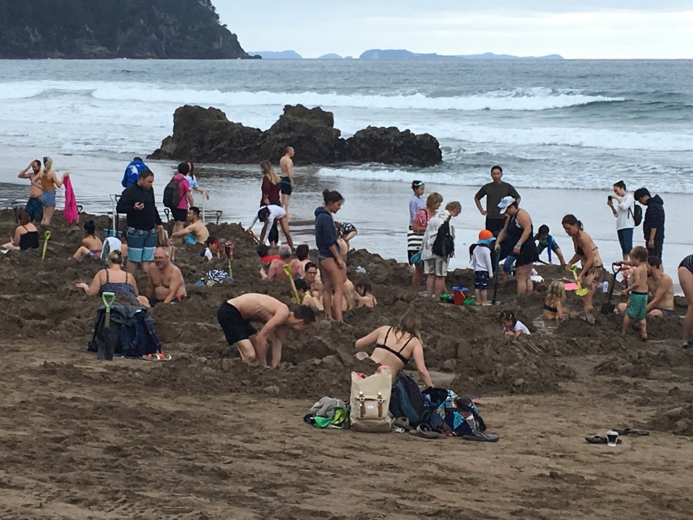 Nun sind wir in Coromandel angekommen, der letzten Station, bevor wir unseren Haus auf Rädern wieder abgeben. Es fiel uns schwer zu entscheiden welche Strände Coromandels wir besuchen wollen, denn es gibt einfach viel zu viele schöne. Natürlich konnten wir uns den Hot Water Beach nicht entgehen lassen… Hier kann man sich eine Schaufel ausleihen, mit dieser gräbt man sich einen Pool am Strand und geniesst das warme Wasser aus der Quelle…in kuscheliger Gesellschaft gleichgesinnter. Hat man Glück oder Babybonus bekommt man die Schaufel und gute Ratschläge zur richtigen Grabtechnik von den Poolnachbarn.